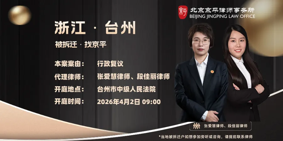 4月2日 本案案由:强制拆除房屋或设施 案件类型:行政 代理律师:张爱慧律师(13520405631)、段佳丽律师(17310261895) 开庭地点:台州市中级人民法院 开庭时间:2026年4月2日09:00