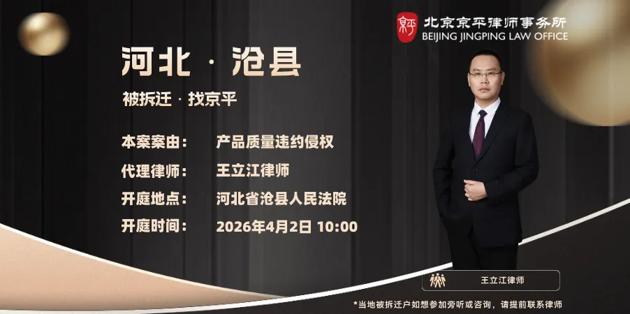 本案案由:产品质量违约侵权 代理律师:王立江律师(18800003178) 开庭地点:河北省沧县人民法院 开庭时间:2026年4月2日10:00