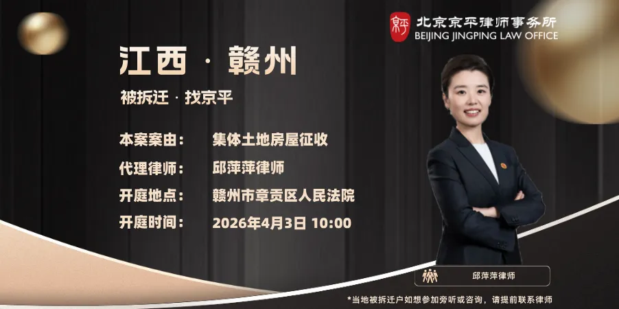 本案案由:集体土地房屋征收 代理律师:邱萍萍律师 开庭地点:赣州市章贡区人民法院 开庭时间:2026年4月3日10:00