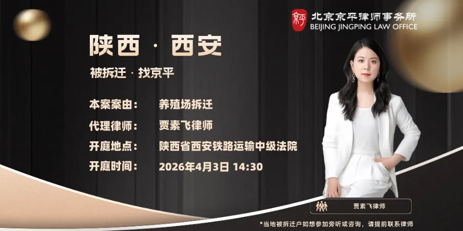 本案案由:养殖场拆迁 代理律师:贾素飞(15910541695) 开庭地点:陕西省西安铁路运输中级法院 开庭时间:2026年4月3日14:00