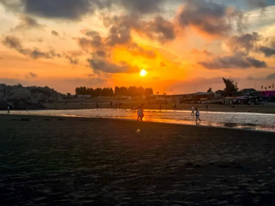 退潮后的宽阔滩涂在斜阳下会形成独特的“金沙大道”景观。