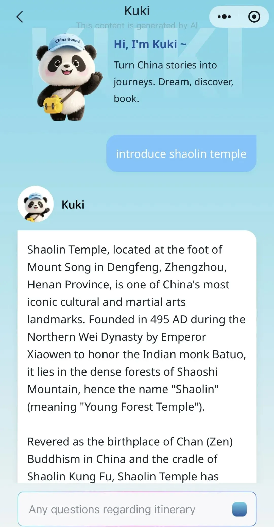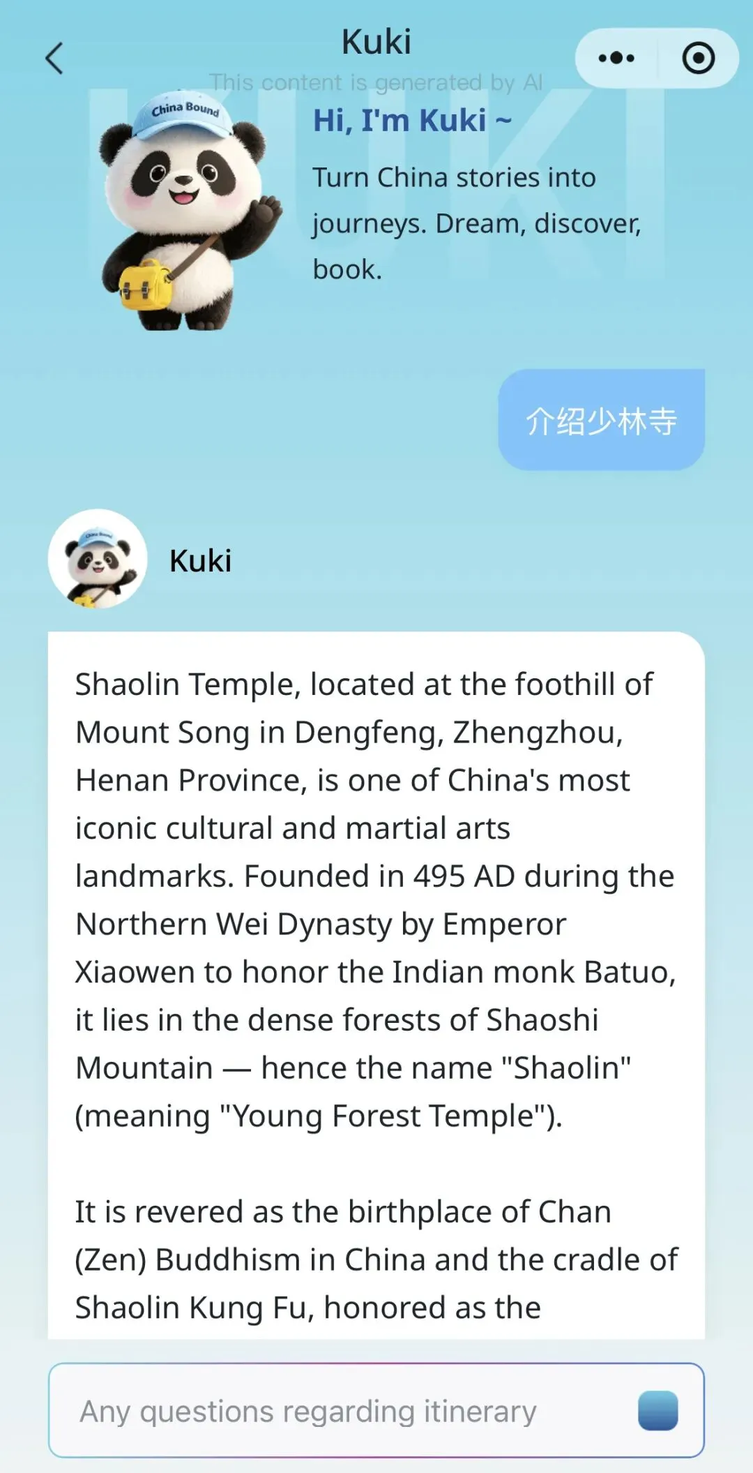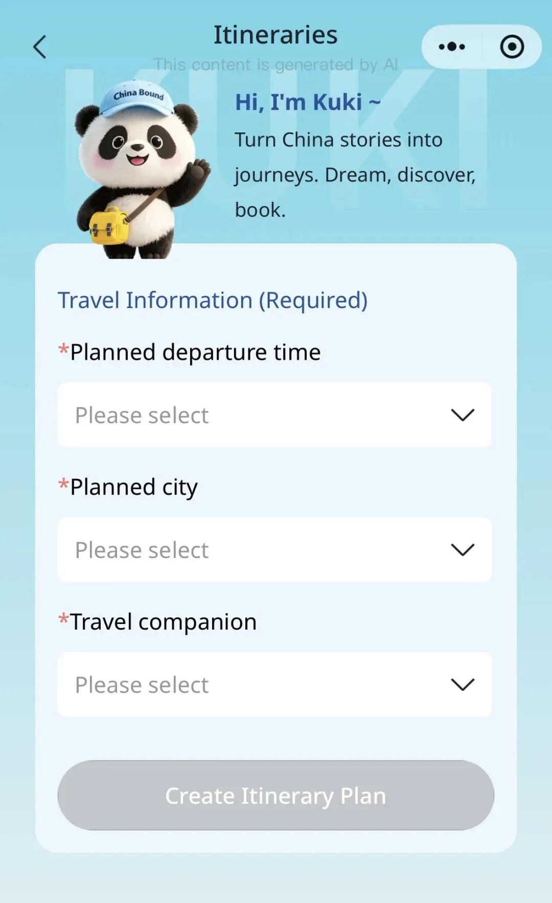 微信端点开最下方的Itineraries即日程之后,可以让Kuki给你定制旅行计划。(支付宝端没有这个页面,只能直接对话)