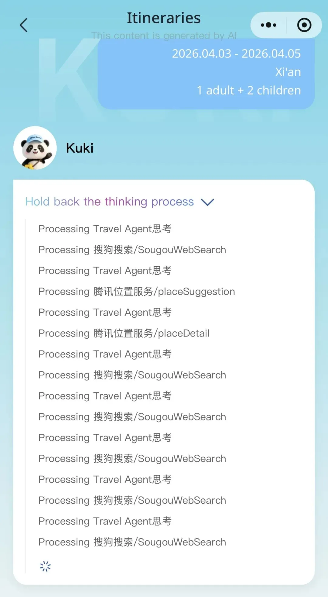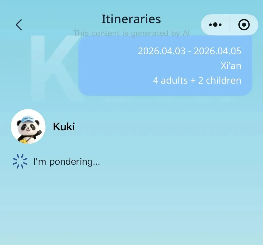 我随便设定了一个出行要求,不知道是因为处于网络拥堵时段还是其他原因,Kuki一直在思考(pondering)。