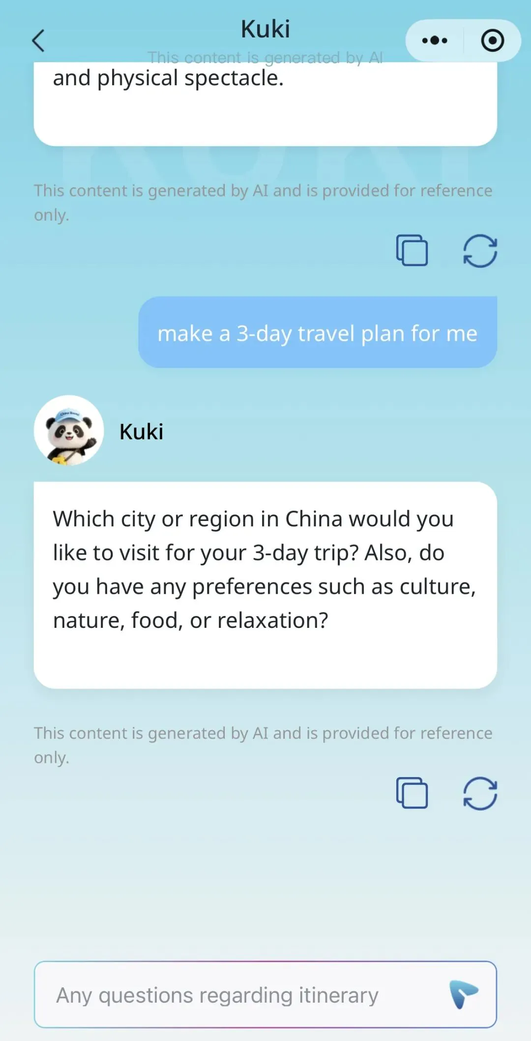 我让Kuki帮我制定个三天的旅行计划,TA还知道追问我更详细要求呢。
