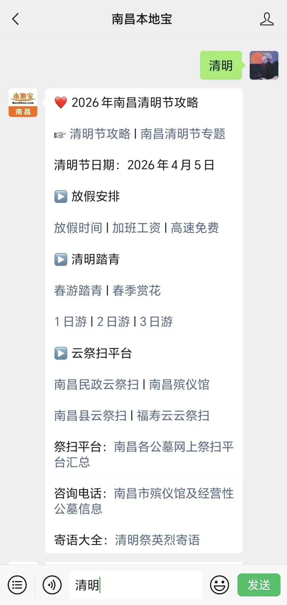南昌本地宝推出非常多的功能,进入【南昌本地宝】公众号聊天对话框里,点击发消息,在对话框内输入并发送对应的【关键词】即可获取相关内容。