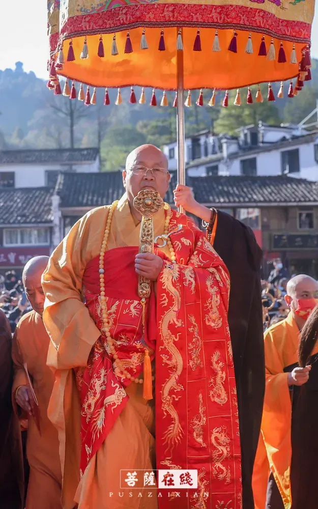 法华寺的开山祖师是心坚和尚,心坚和尚是九华山一代护法名僧。他曾于清末民初破除了九华山下六大家族对山中经济的把持,此外还突破千年陋习,允许比丘尼来山修行,如此才有了九华后山的闵园尼庵群。十人烧香九为财,我国的财神信仰始于北宋,盛行于明清。民间自古就有初四抢路头的民俗,沧海桑田易变,但代代传承的血脉还保留着最初的崇拜。九华山的财神即闵公(闵让和),唐代乡绅,因乐善好施、广济乡邻闻名。民间相传其将九华山赠予金地藏建寺修行,后与儿子道明先后出家,成为金地藏的重要胁侍,后世尊其为“财神”,因布施善行象征“舍财积福”的大乘修行之道。九华山祇园寺、肉身宝殿等许多寺院都供奉闵公,即地藏三尊造像中的长者。每年正月初五及佛诞日,信众纷至祈福,祈愿财运通达、善业圆满。闵公信仰融合大乘佛教文化与民间求财心理,成为九华山独特的人文符号。法华寺住持果尚法师,幼年在九华山祇园寺出家,1992年毕业于九华山佛学院,1997年考入中国佛学院,曾常住北京法源寺、广济寺。2016年九华山佛学院恢复办学,担任常务副院长,2017年任九华山法华寺住持。5、通慧禅林