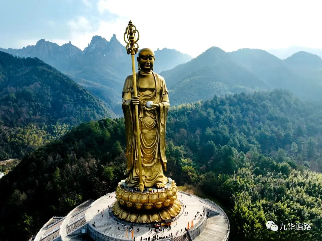 99米地藏圣像是大愿文化园的核心景观,采用2390块铜板铸造,重1168吨,表面镀65公斤黄金,立于直径46.9米的汉白玉莲花宝座上,目前是世界上最高的地藏圣像。九华山能够筹建地藏圣像,得益于仁德老和尚(1926-2001)的号召力,仁德老和尚1990年发愿筹建大铜像,从申报到批复,从动工到完工,前后历时20年。