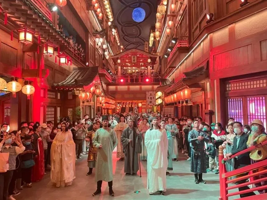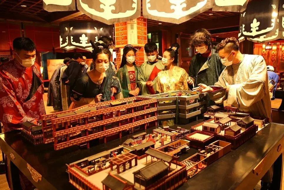 长安十二时辰主题街区是以唐市井文化为源点,以网剧《长安十二时辰》IP为主题,以沉浸式体验为核心,在建筑、软装、钱币、人物、服装、语言、音乐、故事等领域进行全唐化包装,同时围绕深度沉浸式故事体验,设置配套的餐饮、文创、演艺等业态内容,整体打造集全唐空间游玩、唐风市井体验、主题沉浸互动、唐乐歌舞演艺、文化社交休闲等为一体的全唐市井文化体验地。(附近有租汉服的服装店,游客可租用汉服)