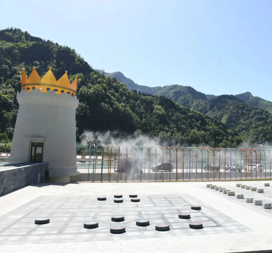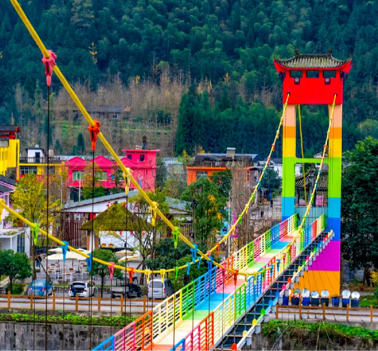 金色清平景区,坐落于绵竹市西北部山区,紧邻龙门山国家地质公园、九顶山国家自然保护区、大熊猫国家公园,享有“金色清平、世外桃源、避暑山乡”的美誉。驱车沿平整山路向上,穿隧道而行,仿佛穿越时光长廊,出隧的瞬间,青山绿水相拥的彩色小镇便映入眼帘。马卡龙色系的民居错落分布,斑斓色彩为青山添彩,宛若山神赠予山野的华裳,梦幻又治愈,随手一拍都是绝美风景。