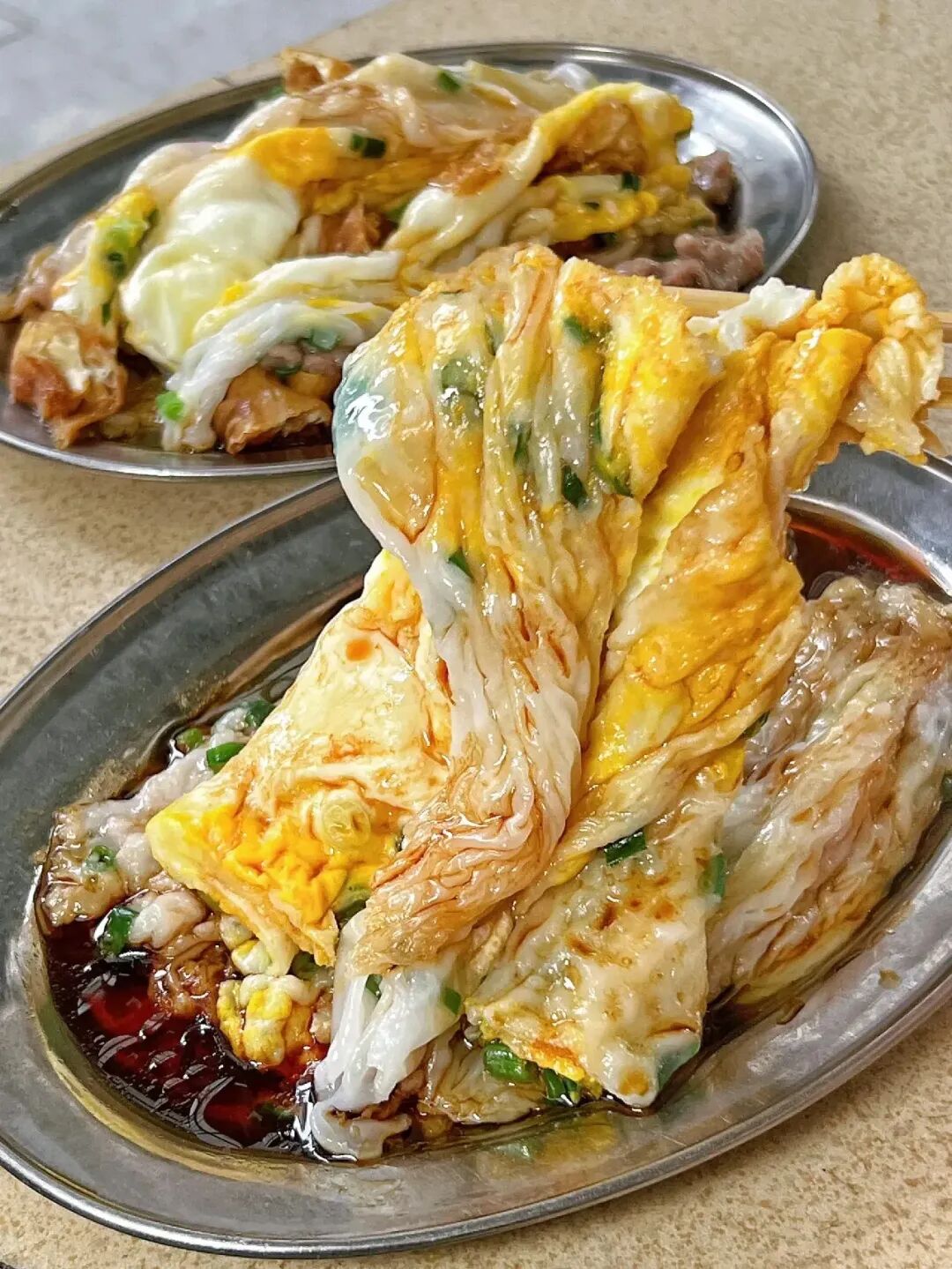 如果说叉烧是"甜咸"的化身,那么烧鹅就是"皮脆肉嫩"的代名词。一只好的烧鹅,皮色必须是深红油亮,如同涂了一层琥珀。上桌前师傅会利落地斩件,皮下脂肪已烤得酥脆,入口即化,肉质则鲜嫩多汁,带着果木熏烤的香气。蘸上一点酸梅酱,酸甜的果味完美中和了油脂的丰腴,让人欲罢不能。 3. 肠粉:米香与馅料的"温柔"邂逅
