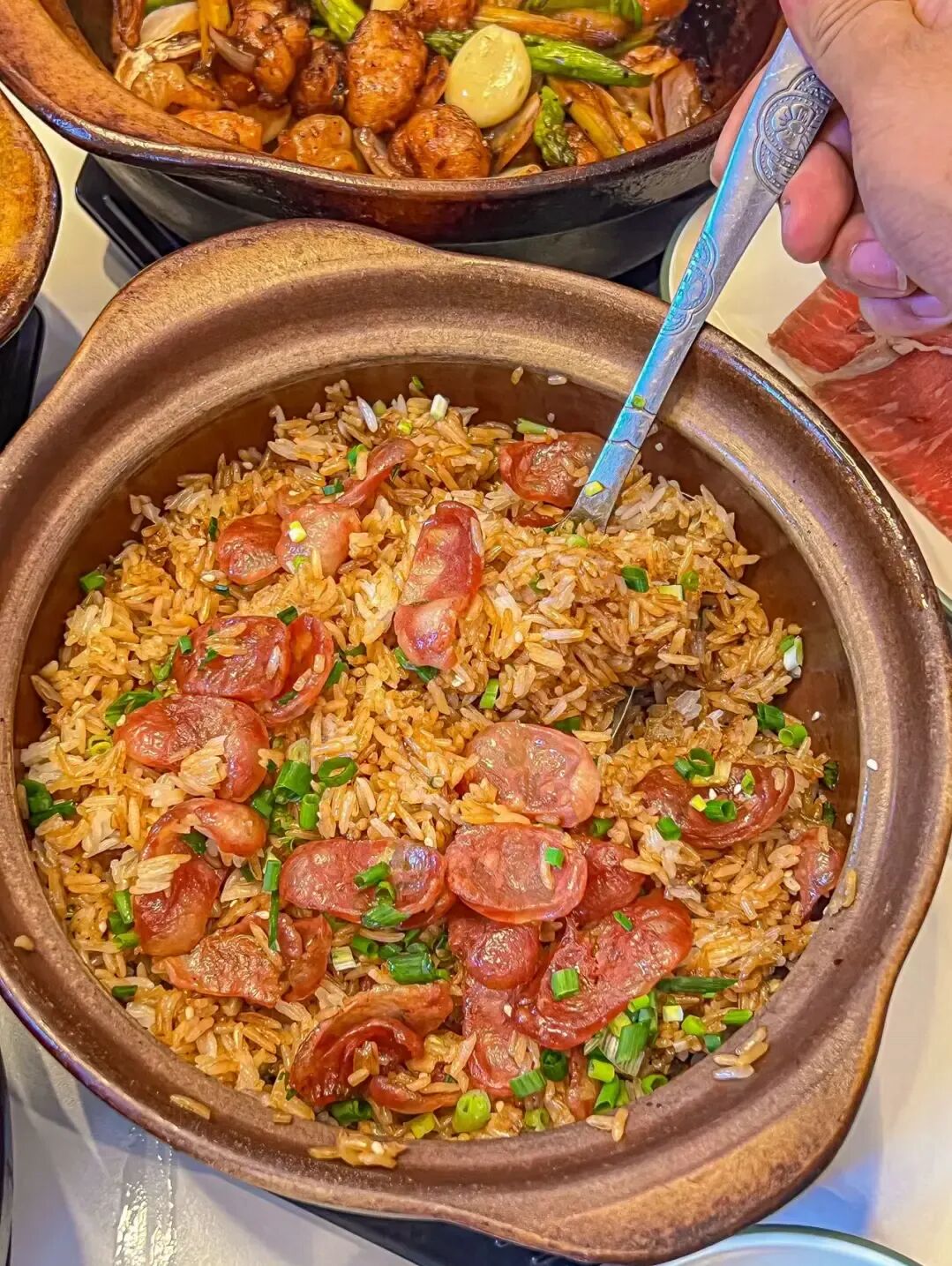 一碗地道的云吞面,是广州人对"小确幸"的定义。它由"三宝"构成:一是完全用鸡蛋和面的"竹升面",爽滑弹牙;二是皮薄馅大的云吞,通常包含鲜虾和猪肉,一口咬下"剥剥脆";三是用柴鱼、虾壳等熬制的汤底,香浓不油腻。三者合一,简单却滋味无穷,是无数老广从小吃到大的味道。 7. 煲仔饭:腊味与锅巴的"焦香"合奏