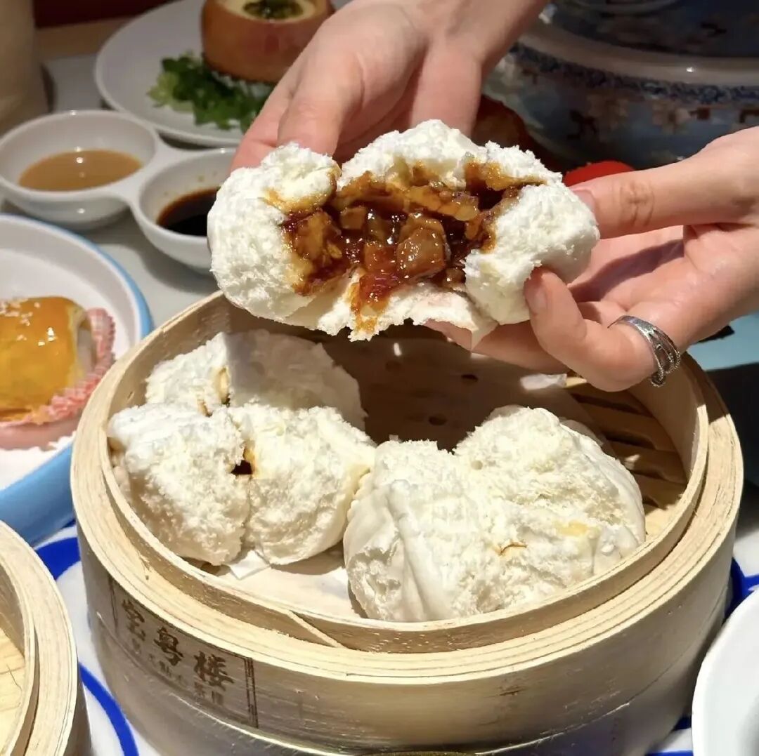 这道看似简单的甜品,实则蕴含着精妙的技艺。将滚烫的水牛奶冲入碗中预先准备好的姜汁里,静待片刻,牛奶便会神奇地凝固成布丁状。入口滑嫩,姜的辛辣与奶的香甜完美结合,既有姜的暖意,又有奶的醇厚,口感层次丰富,具有祛寒行血、养颜美容的功效,是冬日里暖心暖胃的佳品。 10. 叉烧包:咸甜交织的"爆口"惊喜