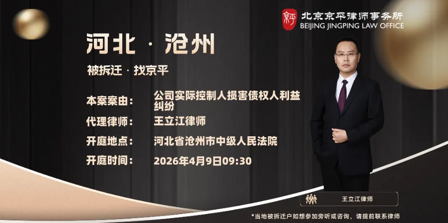 4月9日 本案案由:公司实际控制人损害债权人利益纠纷 代理律师:王立江律师(18800003178) 开庭地点:河北省沧州市中级人民法院 开庭时间:2026年4月9日09:30