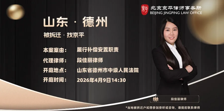 本案案由:履行补偿安置职责 代理律师:段佳丽律师(17310261895) 开庭地点:山东省德州市中级人民法院 开庭时间:2026年4月9日14:30