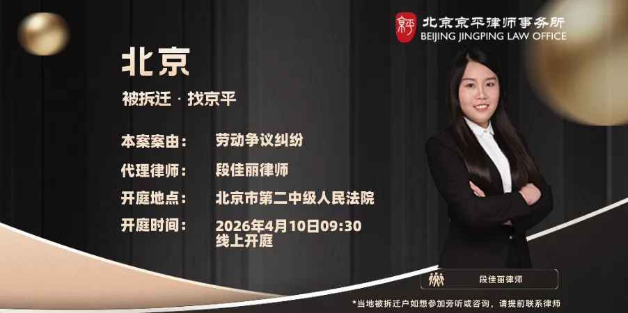 4月10日 本案案由:劳动争议纠纷 代理律师:段佳丽律师(17310261895) 开庭地点:北京市第二中级人民法院 开庭时间:2026年4月10日09:30 线上开庭