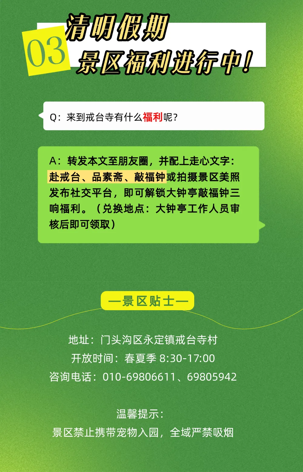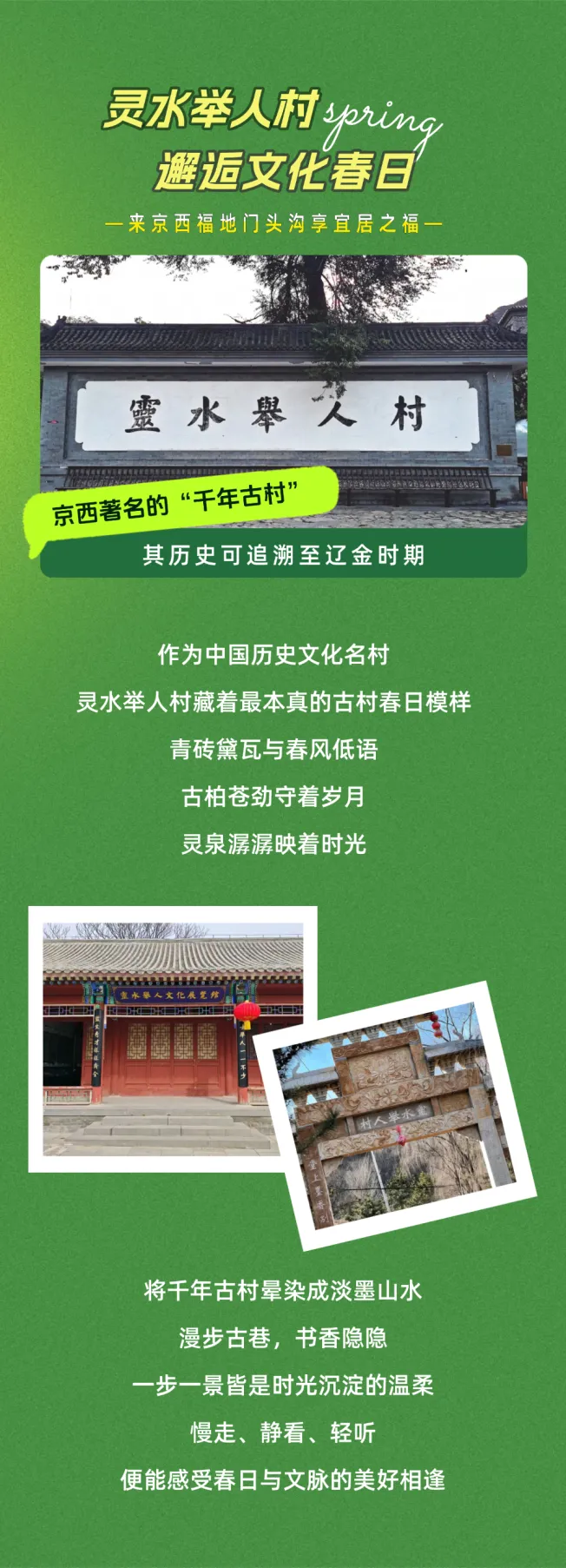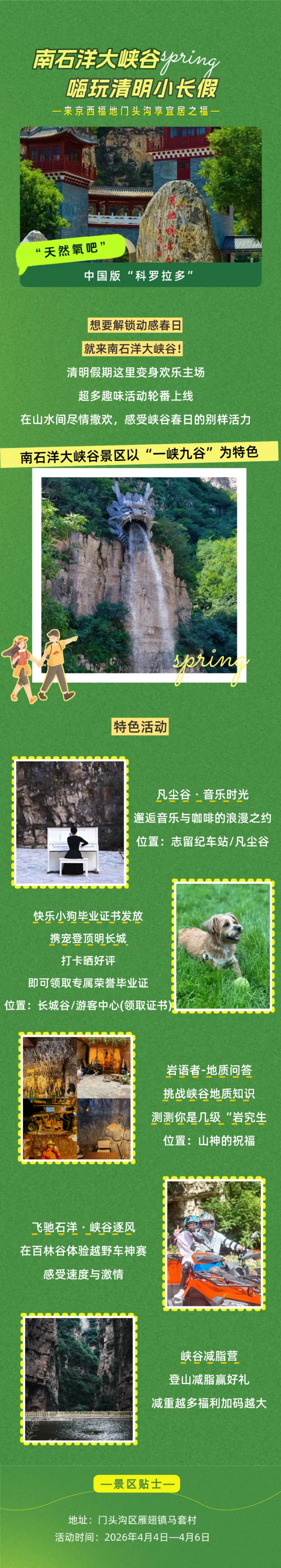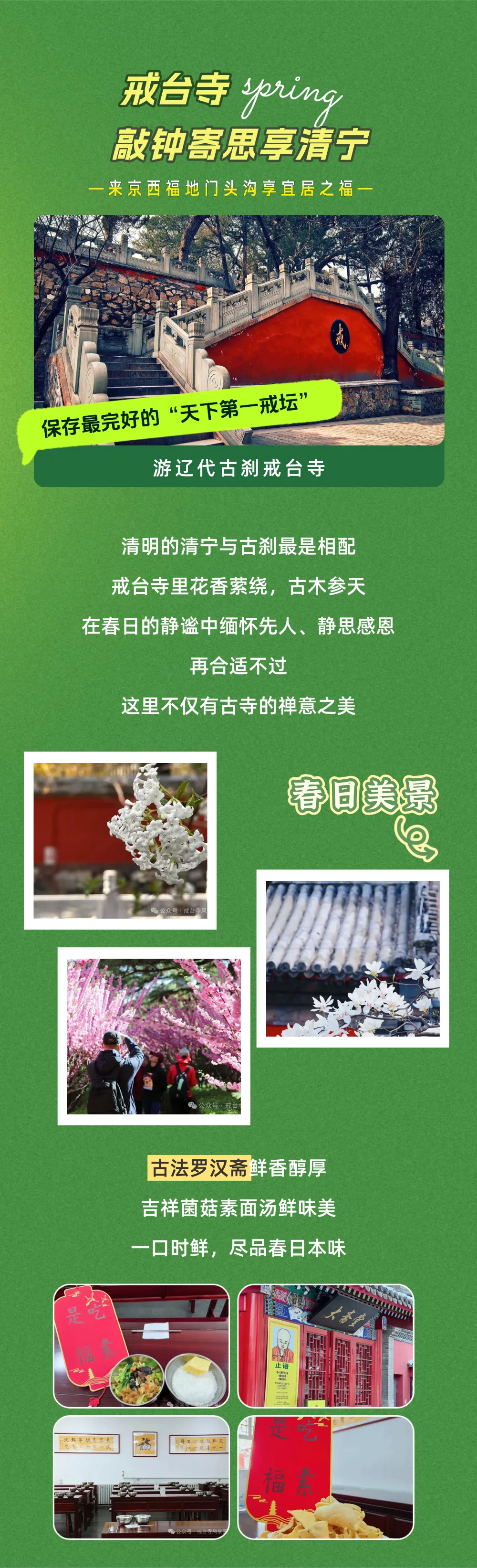 您现在的位置是:首页 > 国内旅游目的推荐 > 正文 国内旅游目的推荐 赴一场春之约!清明假期这份门头沟「旅游攻略」请查收→ admin2026年04月04日 13:40:18国内旅游目的推荐1 赴一场春之约!清明假期这份门头沟「旅游攻略」请查收→··风清景明,春意正浓这个清明假期,告别人山人海奔赴京西福地门头沟解锁一场难忘的春日之旅~🍃🏃💕往期推荐GO门头沟!京蔚高速快游,一脚油门穿越京西山水!gogogo出发喽~来门头沟喝一杯coffee解锁这条 “祈福纳祥” 路线,把好运带回家门头沟文旅汇编整理,来源龙门涧景区、戒台寺、南石洋大峡谷、灵水举人村备注:侵权联系删除 转载请说明来源于"旅荐网",部分内容转载自网络,如有侵权请联系qlwl@foxmail.com删除 本文地址:https://www.15386.cn/post/152327.html 上一篇 郑州“赛里木湖”旅游攻略 下一篇 花式遛娃|清明小长假来丝路,这份欢乐指南太实用了~丝路欢乐世界游玩 相关文章 |学生党3天2晚旅游攻略| 花式遛娃|清明小长假来丝路,这份欢乐指南太实用了~丝路欢乐世界游玩 郑州“赛里木湖”旅游攻略 草长莺飞 春日之约——麦积山大景区清明旅游超全攻略,一键收藏! 五一黄金周襄阳旅游攻略:赴一场千年古城的诗意与烟火之约 “2019滁州旅游迎春活动月”方案来了! 五一江西4日游|懒人必看!江西旅游攻略 #游轮旅行攻略 荆州旅游年卡带你去遛娃!2026 遛娃指南就看这一篇! 标志 #厦门双子塔打卡 #厦门旅游攻略 发表评论 取消回复 评论列表 这篇文章还没有收到评论,赶紧来抢沙发吧~