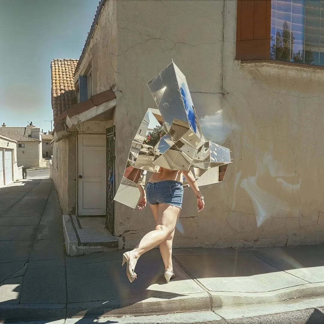 这些限制塑造了作品形态。我无法左右挪步、等待光线变化或调整构图,只能全然接受被拍摄的场景。唯有当所有元素偶然契合时,影像才得以成立。但轻微变形、面容打码、图像故障与拼接痕迹,反而强化了奇异的超现实感,这是实体拍摄无法企及的体验。