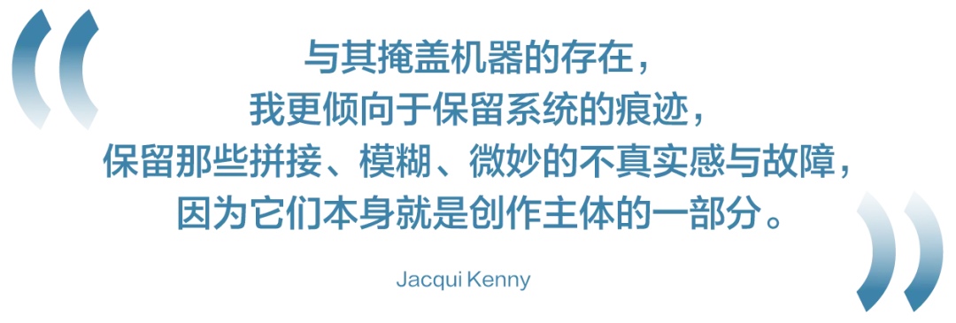 我同样致力于让协作过程可见。与其掩盖机器的存在,我更倾向于保留系统的痕迹,保留那些拼接、模糊、微妙的不真实感与故障,因为它们本身就是创作主体的一部分。