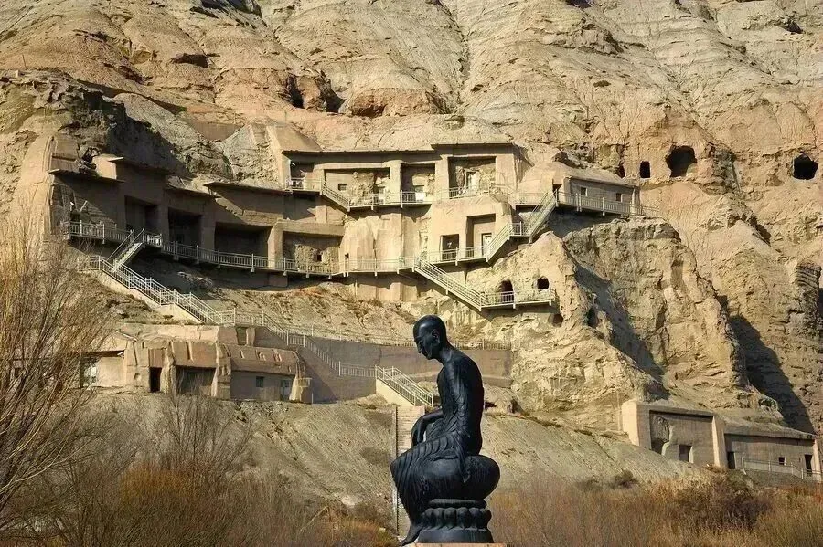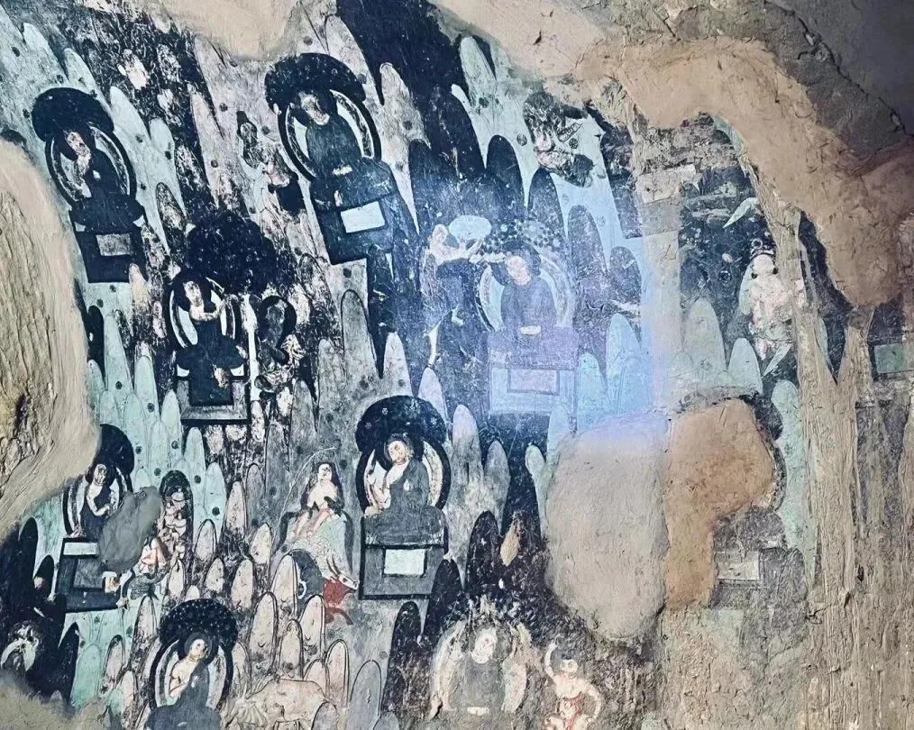 人文遗迹 距谷口约1.4公里处,高约35米的崖壁上发现阿艾石窟,始建于盛唐时期。石窟内保存有精美的壁画,壁画上既有龟兹文题记,也有罕见汉字题记,是汉文化与西域文化交融的见证。
