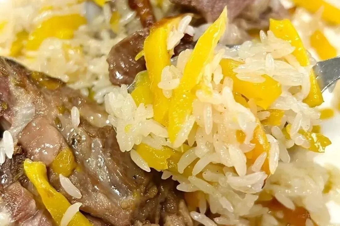 以羊肉、胡萝卜、洋葱、大米为主要食材,羊肉炖至软烂,胡萝卜和洋葱的甜味融入米饭,米粒颗颗晶莹,油亮诱人,是南疆家庭和餐厅的常见主食。