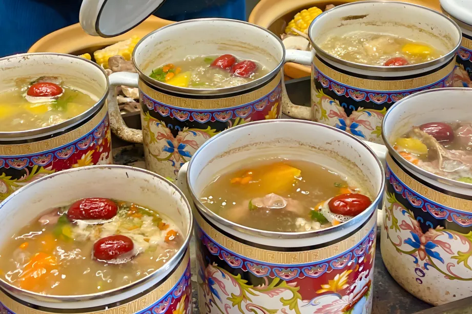将羊肉、胡萝卜、鹰嘴豆等放入搪瓷缸子中炖煮,汤汁清澈鲜美,羊肉肉质鲜嫩,是南疆特色的清炖羊肉版本。