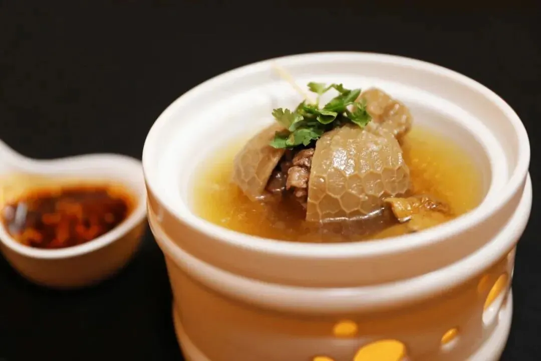 用羊肚最精华的部分包裹羊杂碎,口子用竹签或棉线扎好后直接在清汤锅里煮熟,羊肚软而不烂,内里的羊杂碎鲜美。