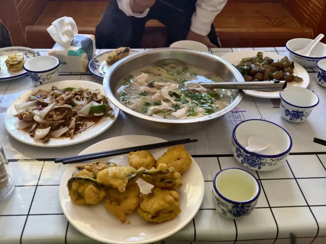 早上9:00日照市区出发,13:30结束上午行程。同事推荐了这个大山鱼馆农家乐,可以自行导航,从南门至此约15分钟。听说最拿手的是这个鱼汤,淡水鱼炖汤(海边人可能会不习惯),点了四菜一汤(鱼汤、茄盒、青菜、粉条、超猪肚)花费160元,菜量一般,口味还可以,吃饭的人超级多。