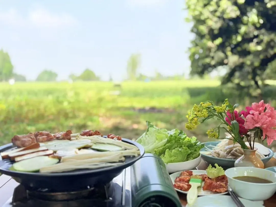 民宿周围有大片麦田、秧田,旁边有自然河流、蒋家河湿地公园,桐花里火锅公园,可采摘李子、桑椹等时令水果的农场。