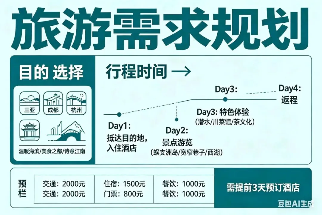 AI就像你的专属旅行助理,你给的信息越精准,它给的结果越贴合你的预期。你必须给AI说清这8个核心信息,一个都不能少: