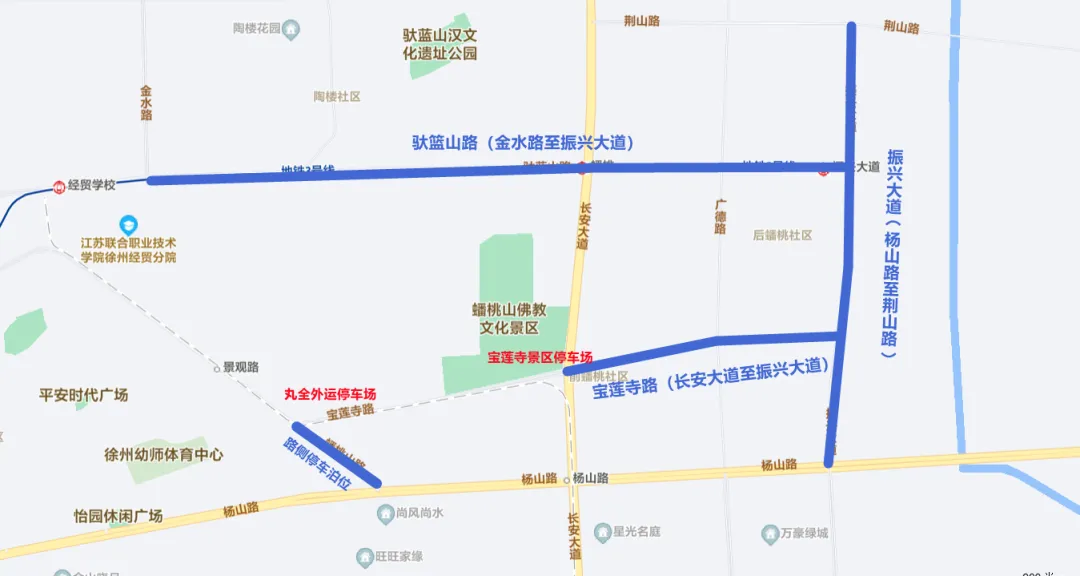 (二)周边道路临时停车 为缓解春节假期期间停车资源紧张,徐州交警将视情临时利用周边道路开辟临时停车泊位: 1.宝莲寺路(振兴大道至长安大道) 2.振兴大道(杨山路至荆山路) 3.驮蓝山路(金水路至振兴大道)