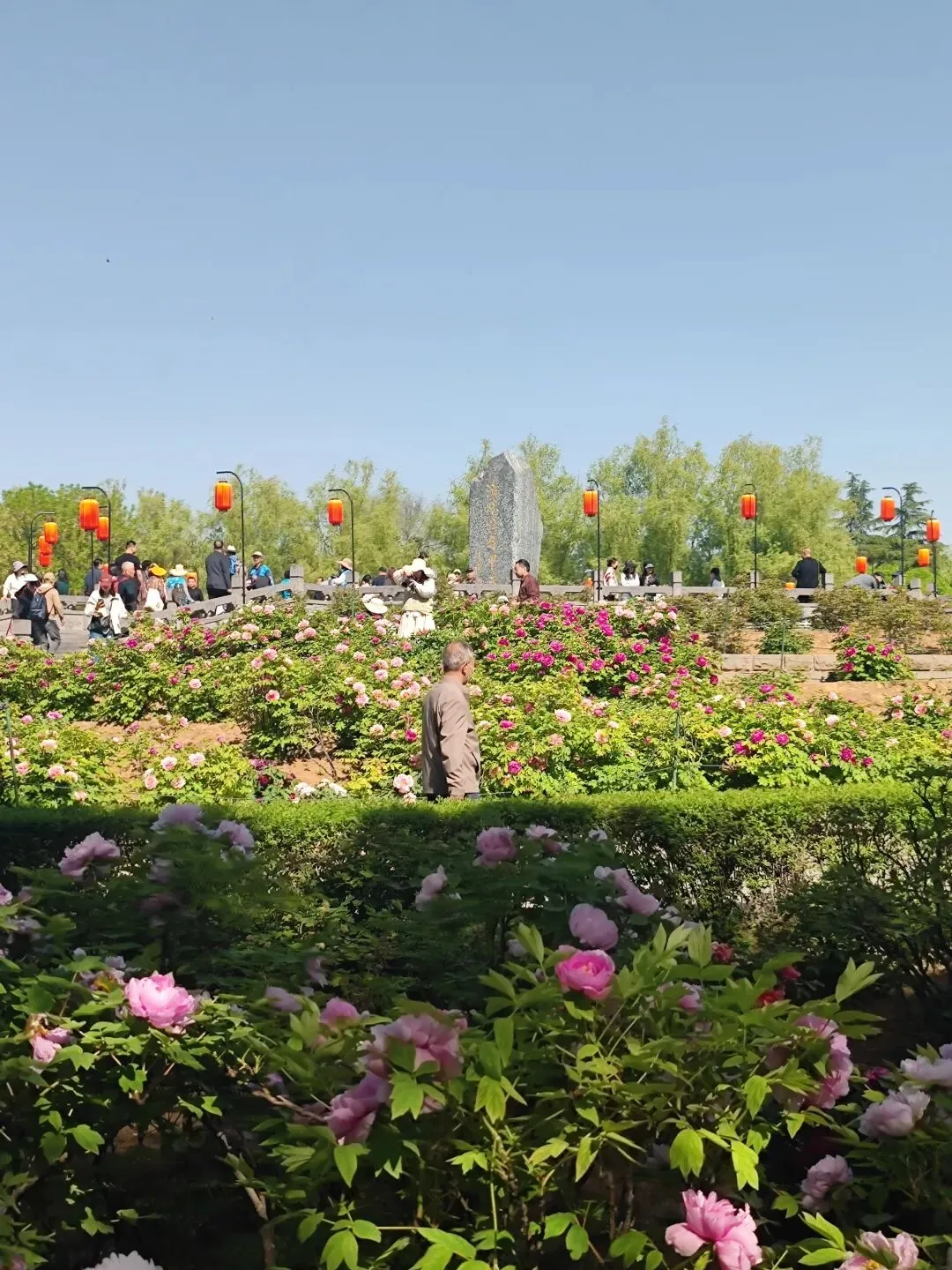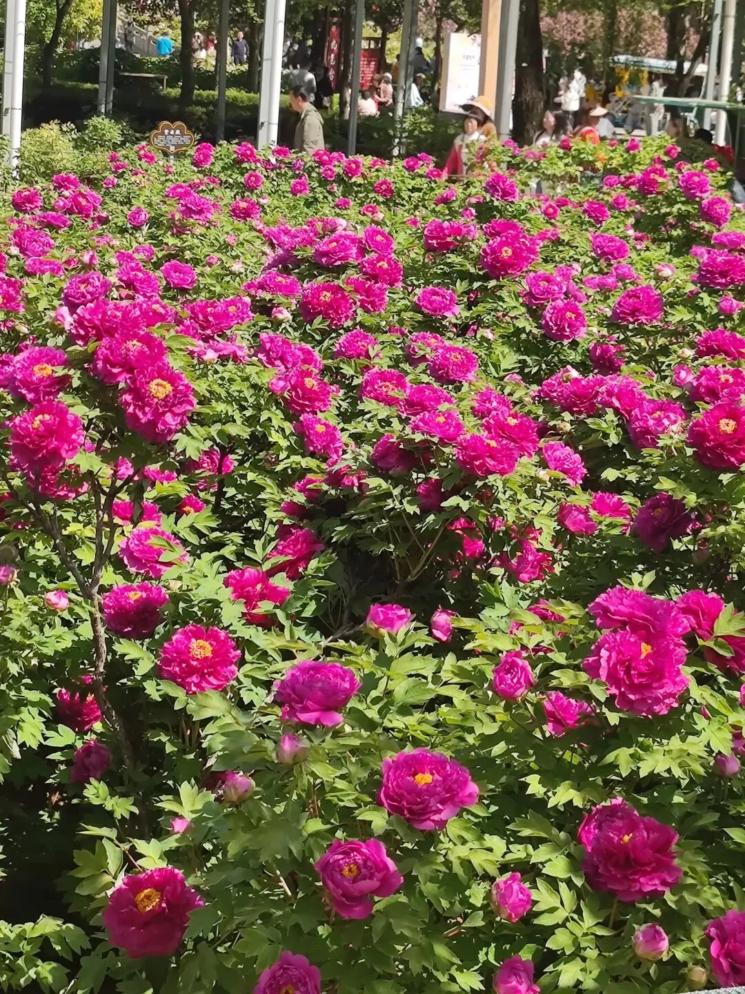 下面终于要放尊贵的牡丹了,小小的枝芽上开出那么多大朵的牡丹花,雍容华贵,简单放几张吧! 对了,车子骑到牡丹园这边可以到西大门换车,这里也是最早的正大门,我们看到这个大门外面排队的是人山人海。 这里面还有一株非常珍贵的牡丹,要排队才能看,因为园子太大了,进去找不到北,时间充裕的话可以问问里面的工作人员,叫金丝贯顶牡丹。
