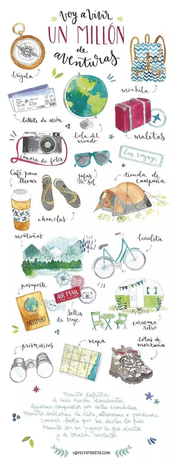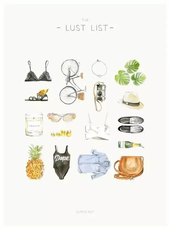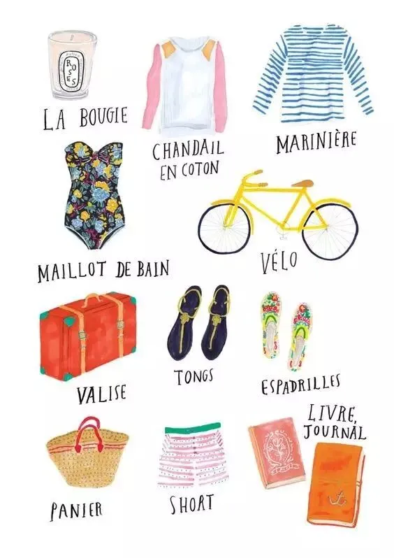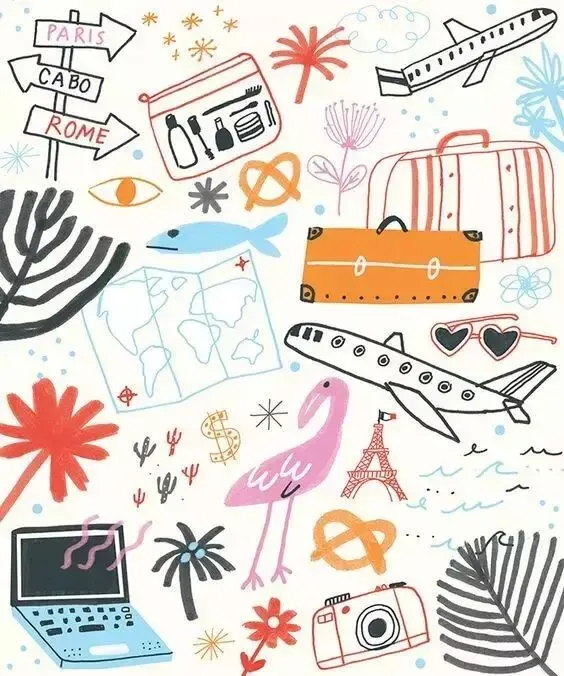 从出发的前几天就开始兴奋!要带上好看的衣服、防晒霜、美美的墨镜还有舒服又好看的鞋子!其实它们画下来也很有趣呀,记录着对旅行的期待和兴奋!