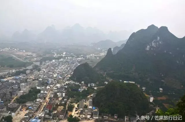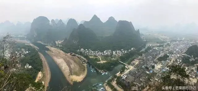 老寨山山顶视野非常广阔,俯瞰一座座喀斯特地貌的孤峰,漓江蜿蜒流淌在群峰间,房子依江而建。