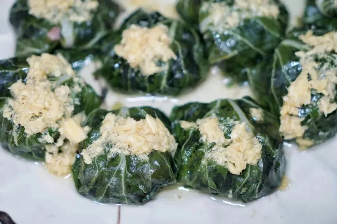 酿菜包是纯手工制作而成的,采用农家金叶菜,馅是用农家韭菜、薯粉、土猪肉混合一起做成的。先把整片的金叶菜用开水煮一下,然后把调制的馅包在用开水烫过的金叶菜里,最后把菜包摆放在锅里加水慢慢熏熟。