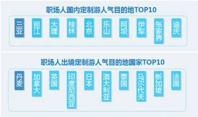 在热门目的地选择上,职场人周边游热门目的地前十名分别为杭州、北京、宁波、重庆、嘉兴、舟山、黄山、上海、苏州、西安;国内长线游热门目的地前十名包括三亚、丽江、大理、厦门、昆明、迪庆、上海、成都、阿坝、杭州;出境短线游热门目的地前十名有大阪、巴厘岛、京都、曼谷、南都留郡、普吉、东京、芭提雅、甲米、奈良;出境长线游热门目的地前十名包括巴黎、罗马、卢塞恩、佛罗伦萨、威尼斯、卢达本纳、比萨、蒙特勒、米兰、开罗。
