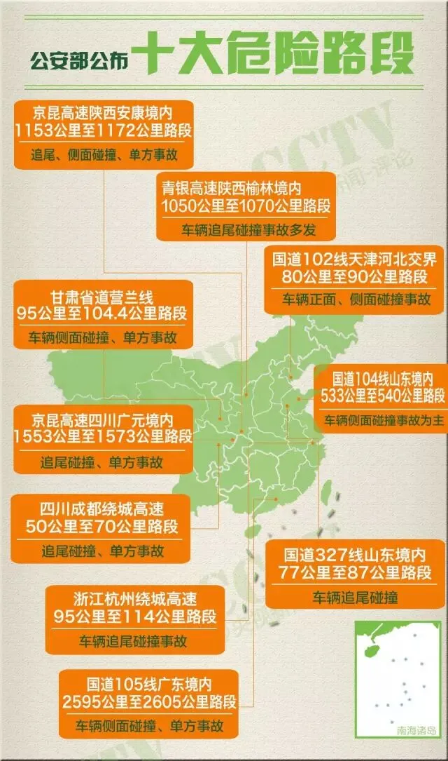 根据公安部交通管理局最近一期公布数据,全国交通事故多发、死亡人数集中的10个路段。如果你的行程途经这些路段,一定要小心!