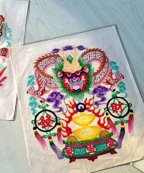 别的地方剪纸是拿剪刀剪,蔚县剪纸是拿刻刀刻,而且刻完还要点彩,用毛笔一点一点把颜色点上去,一张巴掌大的剪纸,得刻三四天,点彩又得两三天,成品你拿手上看,那个细腻程度跟工笔画没区别。更关键的是,这些老艺人不是在搞艺术创作,是在做生意,他们很清楚什么图案好卖,什么颜色搭配讨喜,所以你能看到传统题材和现代审美在这里找到了一个特别自然的平衡点,这种平衡不是刻意设计出来的,是市场逼出来的。