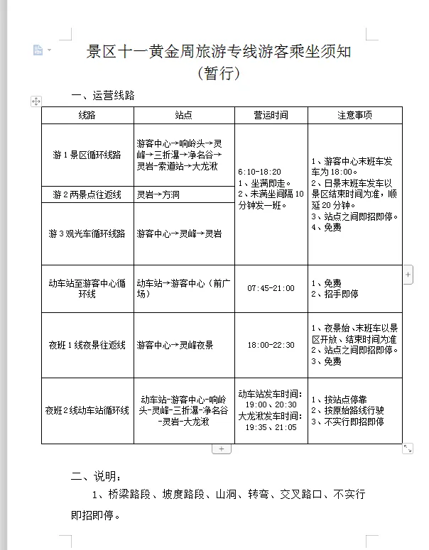 (一)根据《温州市雁荡山风景旅游管委会关于调整雁荡山风景名胜区交通组织的通告》规定和维护“国庆”假期景区及周边道路安全畅通工作需要,对进入景区车辆实行交通限流。限流期间实施抢险、消防、医疗救护、警务等任务的特种车辆可以直接进入景区,核心区居民车辆、工作人员车辆、公务用车凭《雁荡山风景名胜区车辆通行证》通行,其他车辆(除旅游团队大客车)停靠雁荡山旅游集散中心,游客可步行或换乘免费旅游环保车进入景区游览。