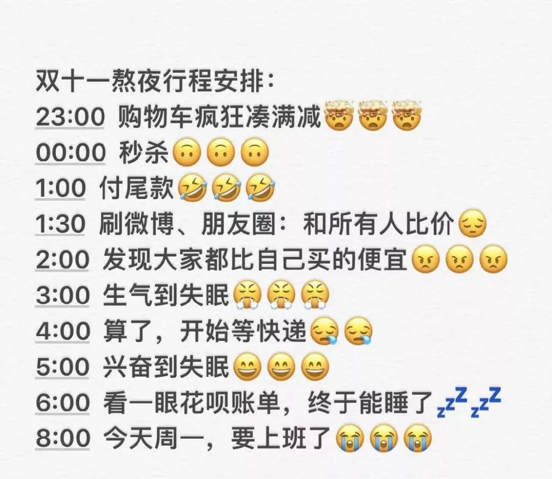 一年一度的“双十一” 马上就要到来了 你的购物车塞满了吗? 定金付了吗? 楼盖了吗? 账算明白了吗? “双十一”你准备买啥? “双十一”的你,又准备熬夜到几点? 有网友分享了自己的“双十一”熬夜行程表↓↓↓