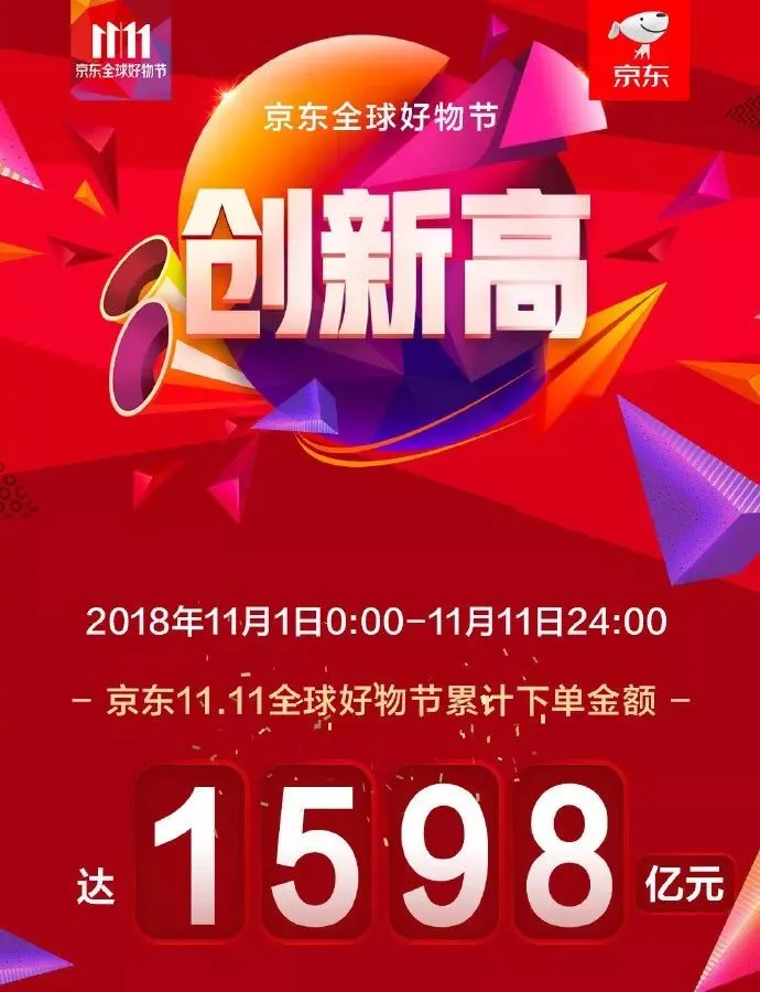 京东:2018年11月1日00:00至11月11日24:00,京东11.11全球好物节累计下单金额达1598亿,再创新纪录!
