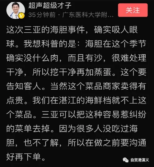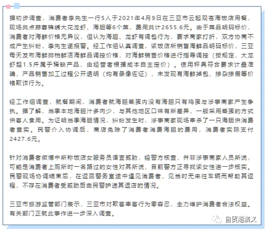 不出所料,在这个阳春的旺季里,三亚又火了一把。这回源头在大东海一家海鲜餐厅,起因仍是“宰客”疑云。笔者出差在外,昨天途中看到微信朋友圈沸沸扬扬,还以为天要塌了,不过仔细再瞧来龙去脉,觉得并不是那么严重。 9日晚,来自浙江的李先生等四大一小5位游客,在海鲜餐厅消费时发生了一段“插曲”:所点的“海胆蒸蛋”里不见海胆只见蛋,又嫌龙虾价格过高且怀疑被调包。在与商家理论后,被“服务员”威胁道:“不要闹事,不然走不掉”。李先生于是报警,声称受到惊吓,紧急求救。警察第一时间赶到,协调双方按实情并适当减免,完成了交易,之后用警车将5人“护送”至所住酒店。 本来事到此处已了结,但李先生意犹未尽,接着又转战网上,发帖“曝光”,动员更多人来围观并参与“声讨”。果然,掀起了一场舆论风波,与历次网络事件如出一辙,吃瓜群众不管三七二十一就跟着骂了起来。 发现这个网络举报后,三亚官方当即成立由公安、市场监管、旅游监管、综合执法等部门组成的工作组开展调查,并很快在政府平台“三亚发布”上公开了调查进展: 不难看出,这个调查报告及时、客观、中肯,且还留有余地,一旦发现新情况、新证据,或将进一步处置。