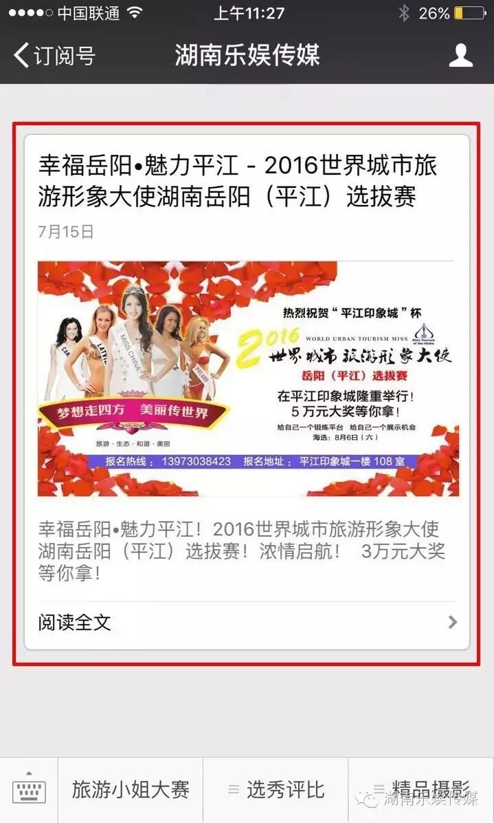 1、先闗注“湖南乐娱传媒”公众平台,然后点击弹出图文(如下图),或回复“投票”,点击弹出图文进入大赛主页