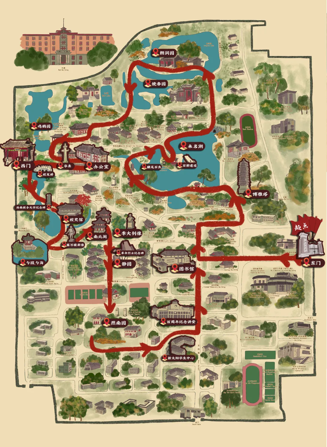 东门-图书馆-博雅塔-未名湖-翻尾石鱼-石舫遗迹-朗润园-镜春园-鸣鹤园-华表-办公楼-校友桥-西门-国立西南联合大学纪念碑-校史馆-勺园、勺海-塞万提斯像-南北阁-李大钊像-革命烈士纪念碑-静园-燕南园-百周年纪念讲堂-新太阳学生中心-图书馆-东门