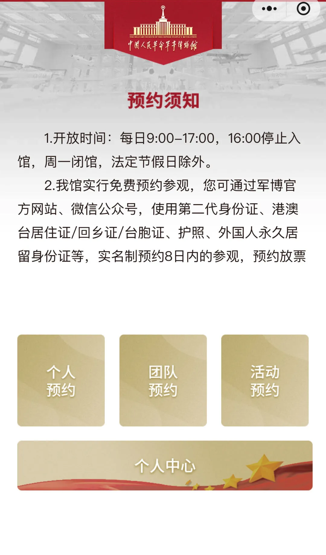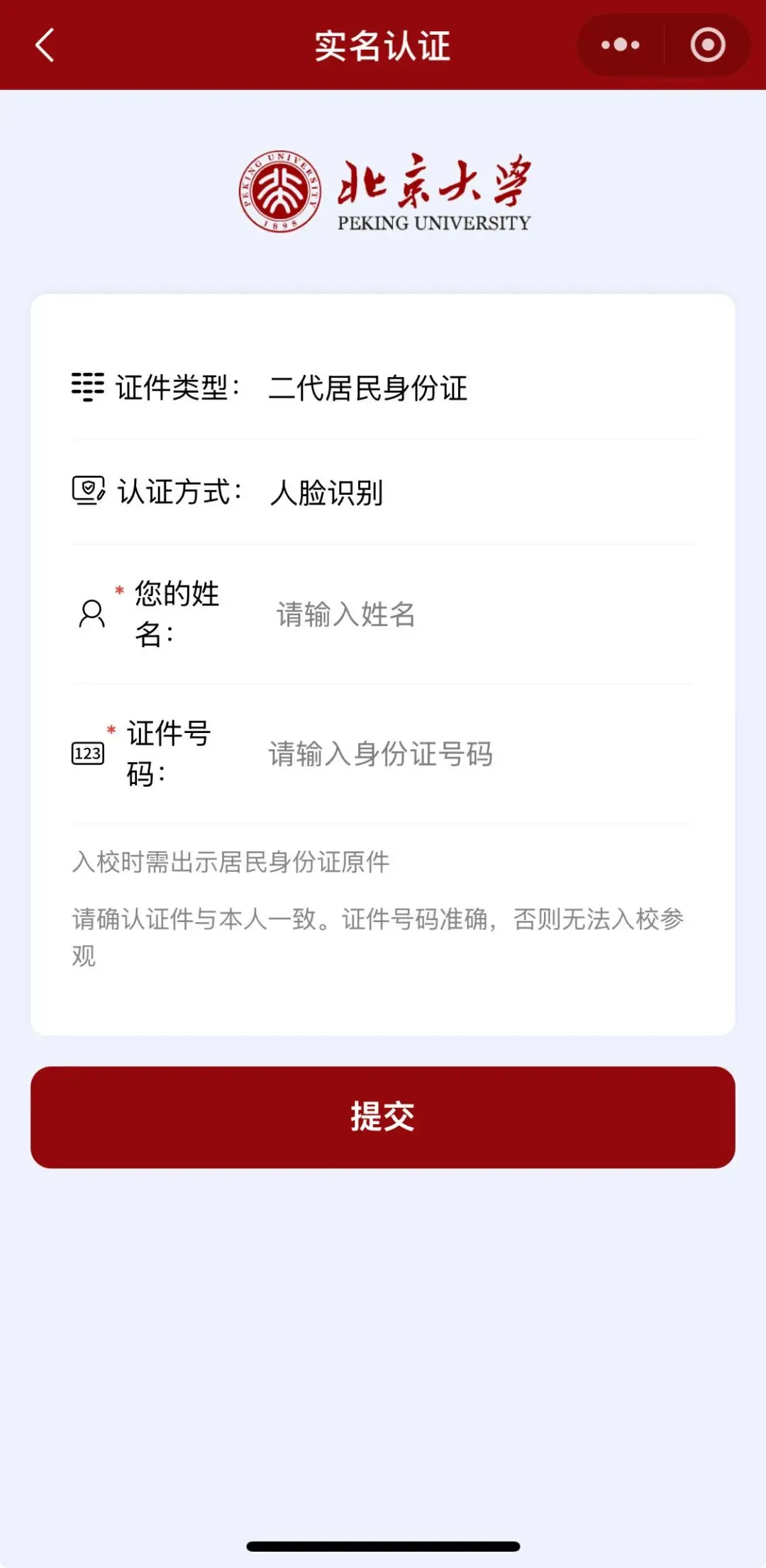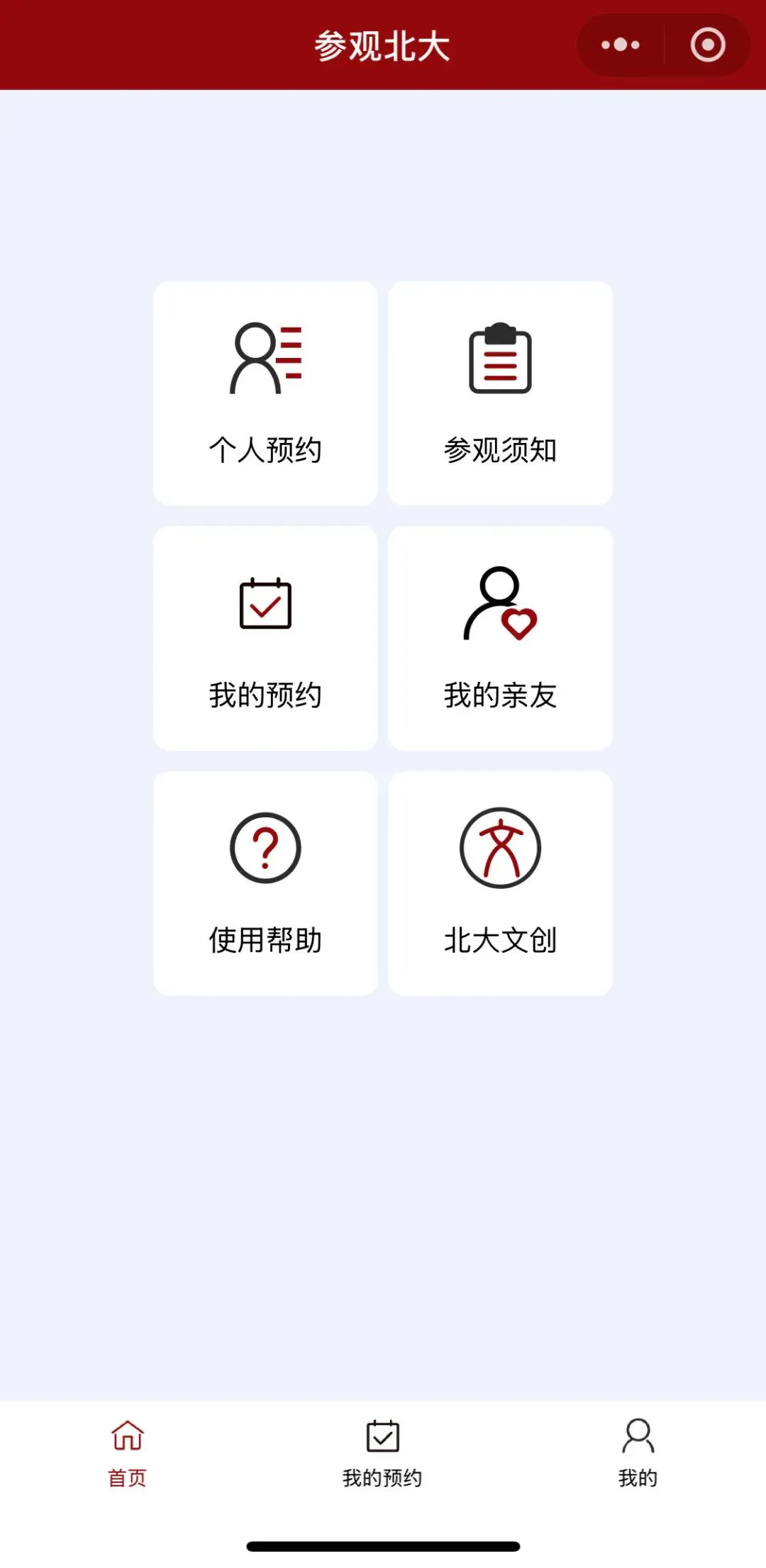 2. “参观北大”微信小程序是个人预约参观的唯一官方渠道,请使用本人有效身份证件进行申请。暂不开放预约机动车入校。