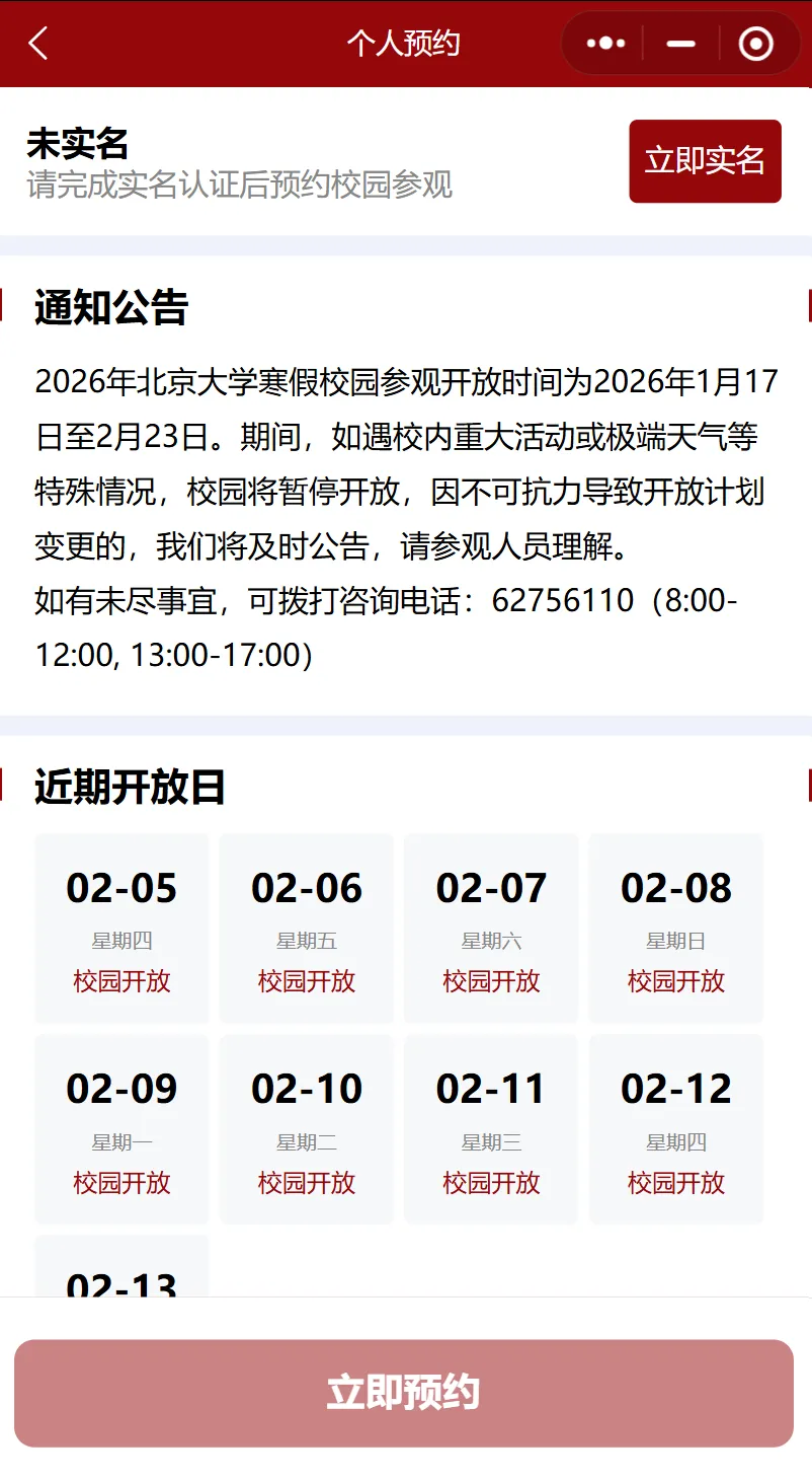 2026年北京大学寒假校园参观开放时间为2026年1月17日至2月23日。现已进入春季学期,常态化开放,如遇校内重大活动或极端天气等特殊情况,校园将暂停开放,因不可抗力导致开放计划变更的,我们将及时公告,请参观人员理解。如有未尽事宜,可拨打咨询电话:62756110(8:00-12:00,13:00-17:00)