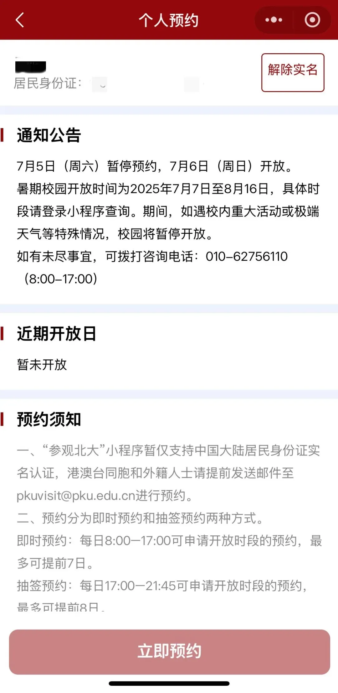 一、“参观北大”小程序暂仅支持中国大陆居民身份证实名认证,港澳台同胞和外籍人士请提前7日发送邮件至pkuvisit@pku.edu.cn进行预约。