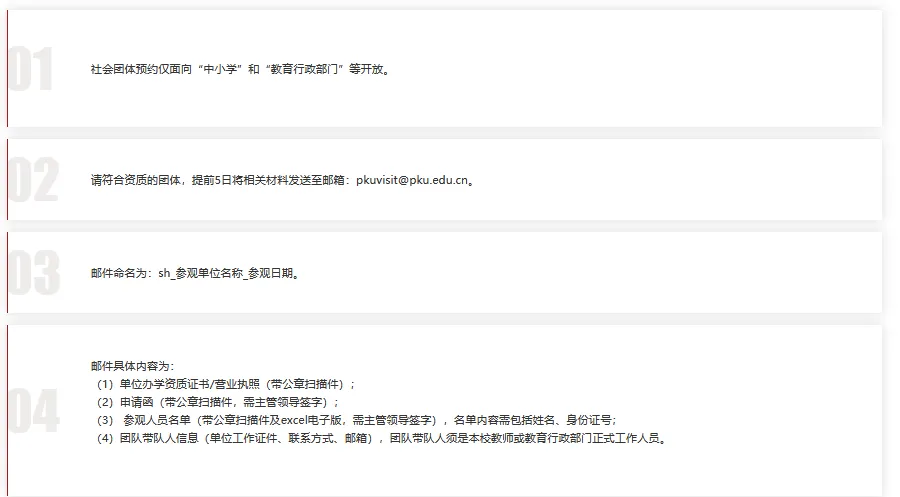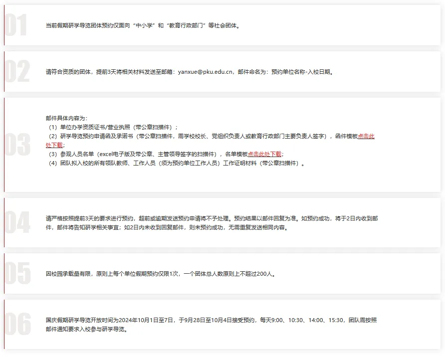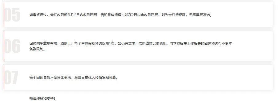 因校园承载量有限,原则上一个团体总人数不超过200人,请提前3天进行预约。如预约成功,将于2日内收到告知邮件,邮件将告知团体入校具体流程。