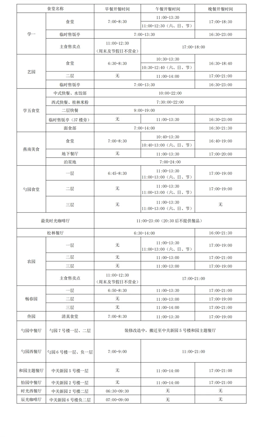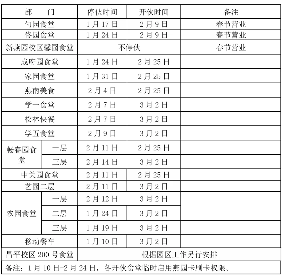 12. 学校家园四层、艺园二层、畅春园三层(西门外)、勺园中餐厅、勺园西餐厅对外开放,支持现金/电子支付;校内其他食堂仅限校内师生凭校园卡消费,不对外开放。