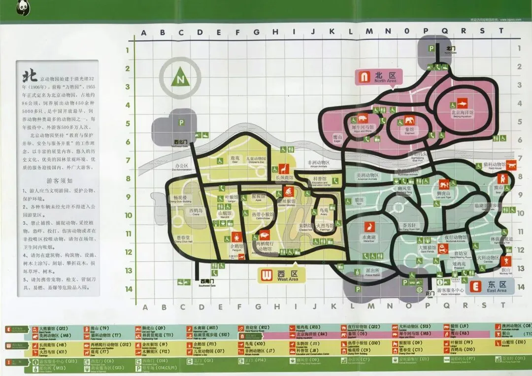 北京野生动物园步行游览区游览线路全长2千米,有20余种、共300多只动物可与游客互动、投喂,设有动物场馆30多个,突出开放式的理念,具有场馆设计新颖、观赏角度多样、视觉障碍少、人与动物相互接触等特点。最大限度的拉近人与动物的距离,增加人与动物的接触,体现人、动物、环境彼此间的和谐相处。