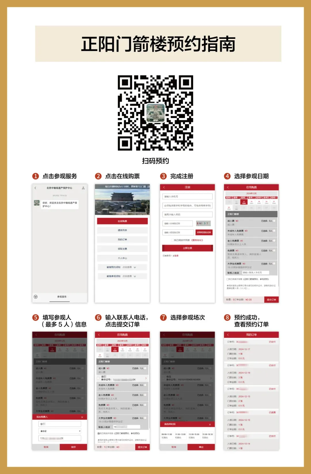 6. 不满8周岁的未成年人应进行登记,不占预约名额,须由预约成功的成年亲属陪同入校。单笔预约单至少有1名成年人,每单最多可预约4名8岁(含)以上人员及2名8岁以下未成年人。
